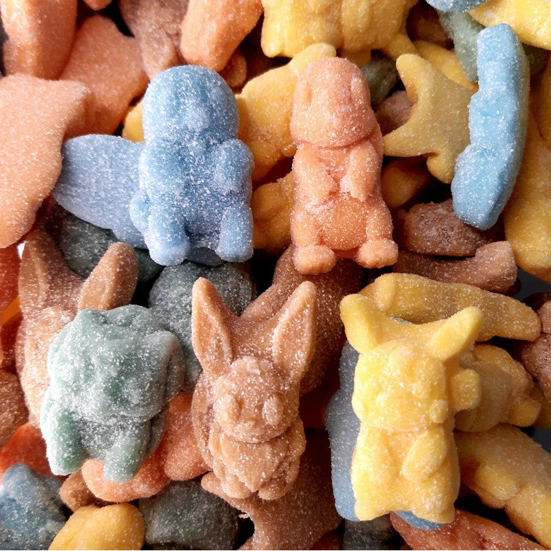 Ces bonbons Lutti sont des reproductions de Pikachu, Salamèche, Bulbizarre, Evoli, Carapuce, les personnages dans Pokémon. Ils sont colorés et parfumés aux fruits par des substances naturellement authentiques comme le carthame, la patate douce, la pomme, le citron, la curcumine.